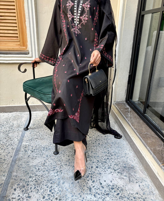 Embroidered Chiffon Frock - Black